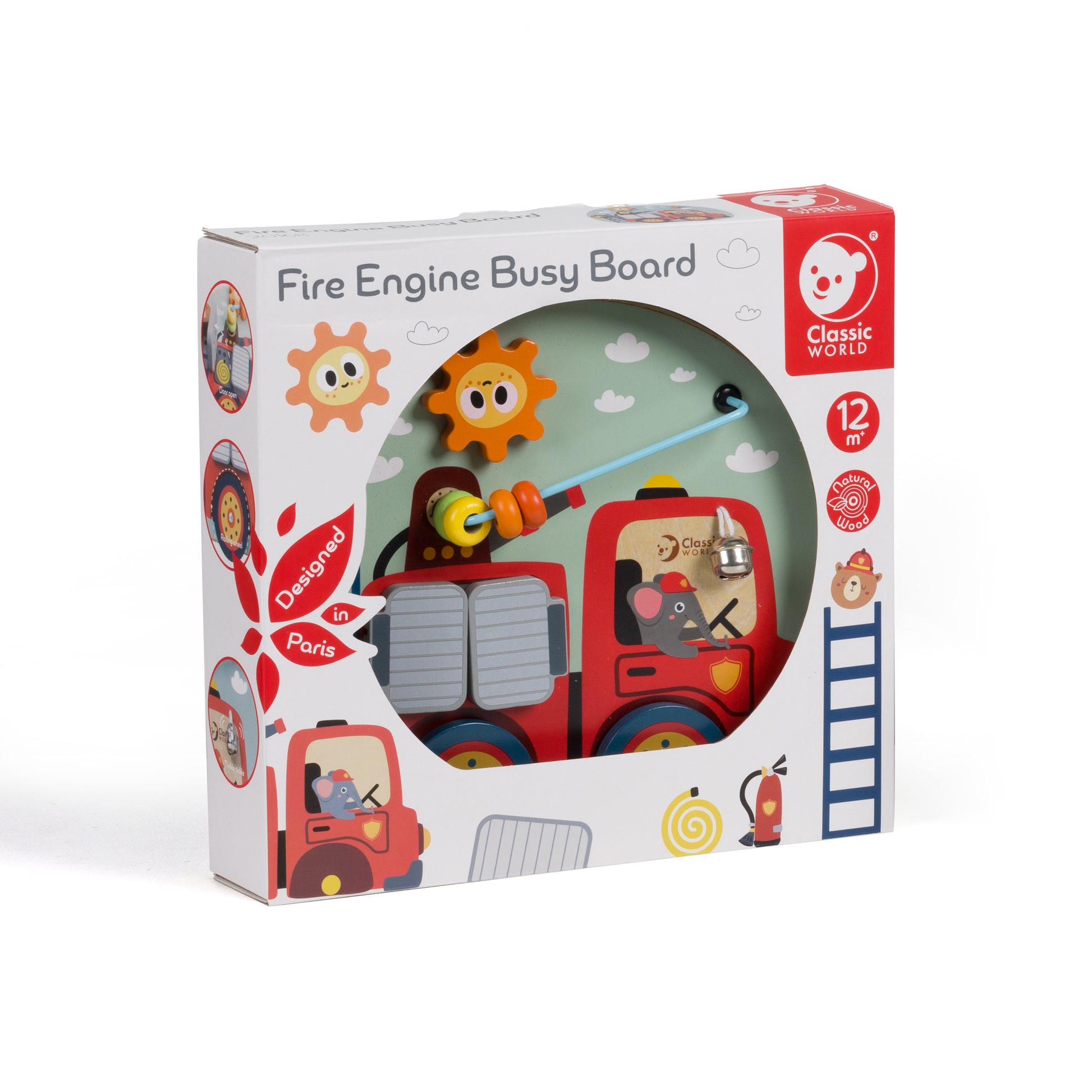 This firetruck-themed busy board combined with gear, beads game, maze, doors, bell and wheels functions. It features the fire extinguisher and hose as a hidden surprise behind the doors.