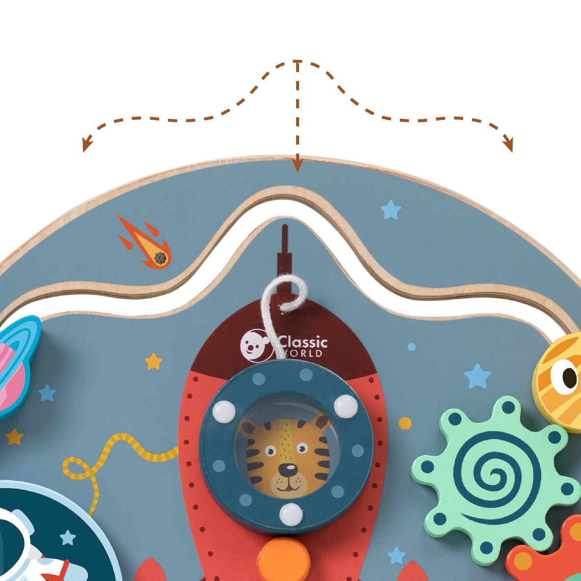 This rocket-themed busy board combined with the maze, turning blocks, gears and beads game functions. Children will learn the spell of the sea animals' names while enjoying the activities.