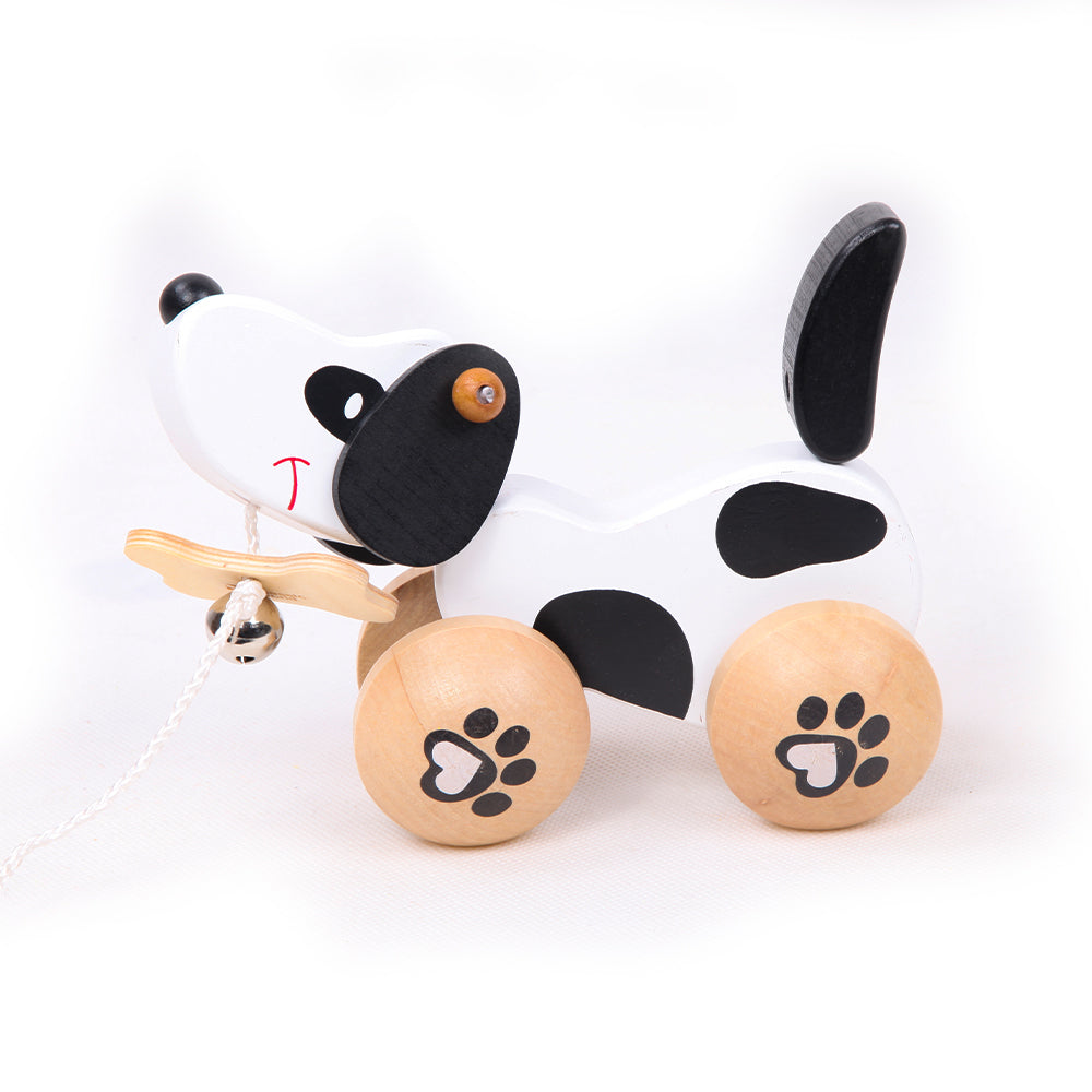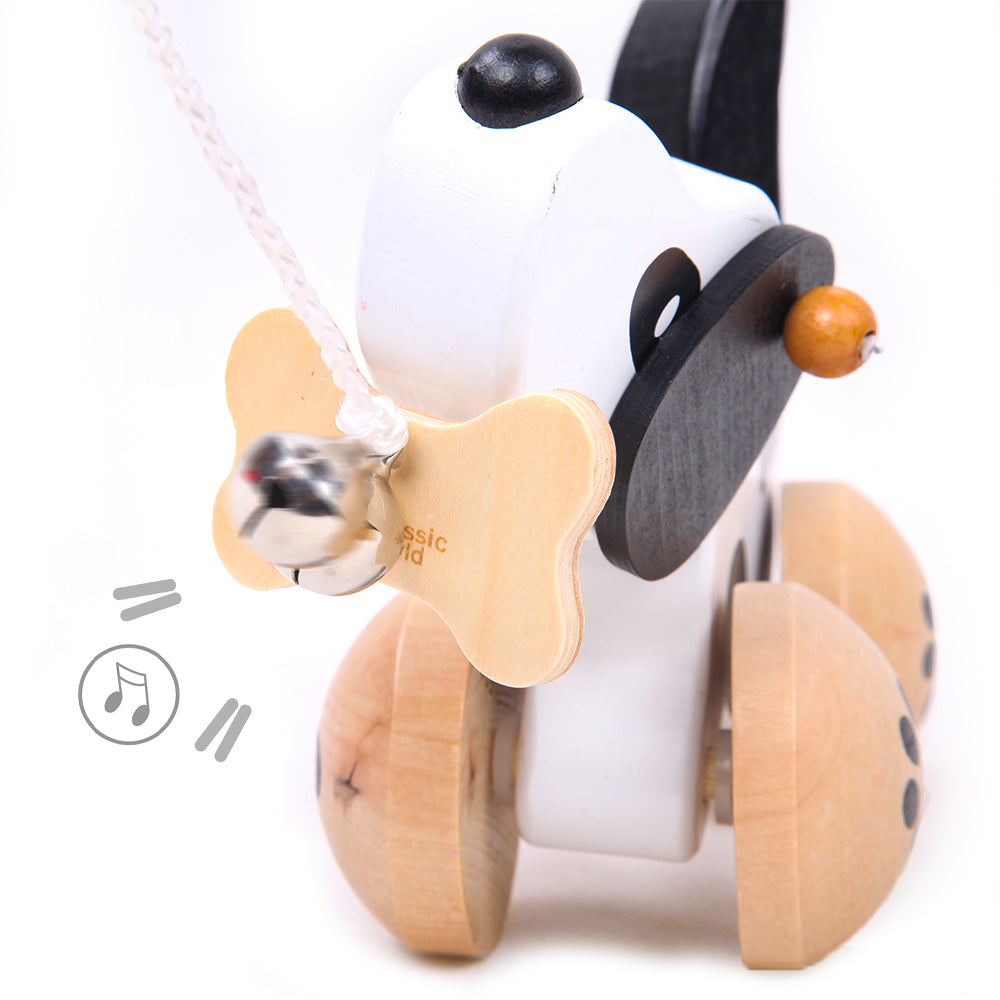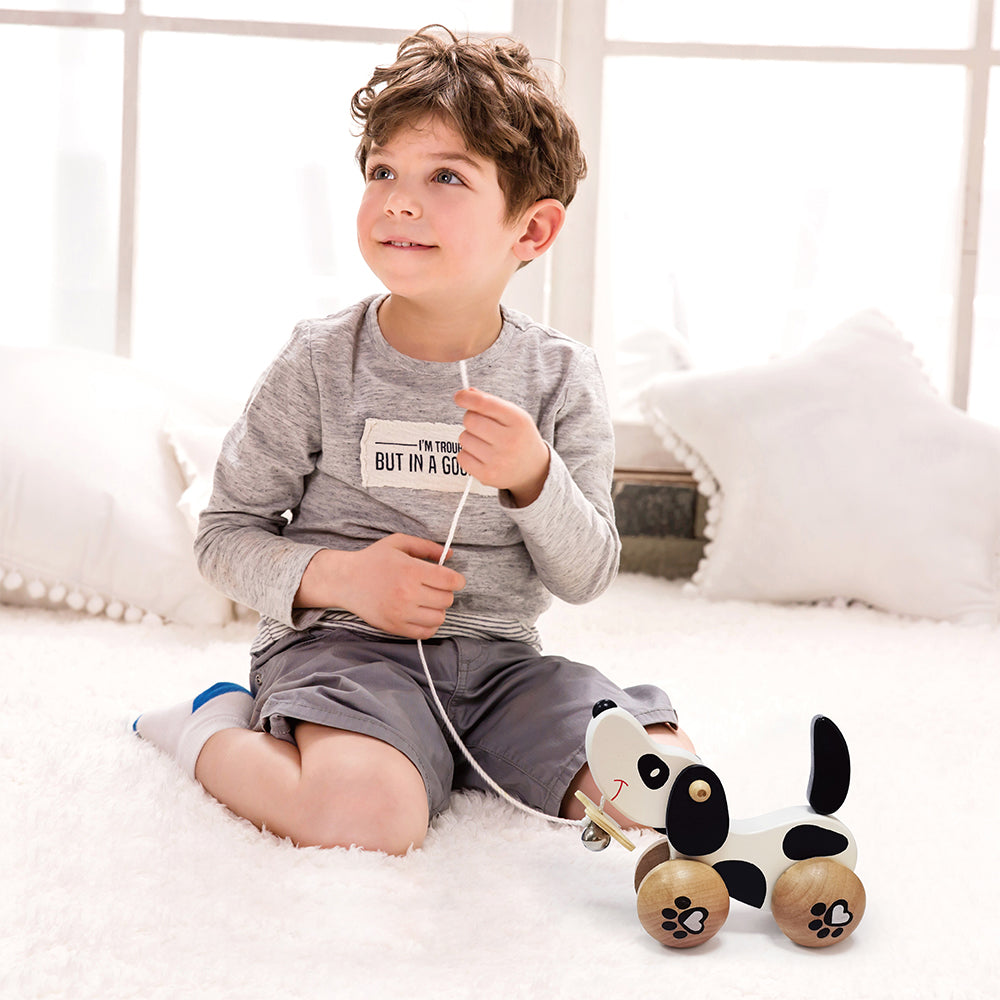 Push or pull this adorable little pull dog. Encourages imitative and imaginary play. Stimulates early walking and promotes role play and creativity.