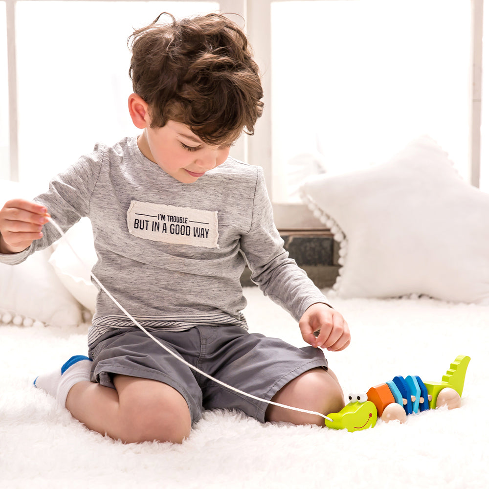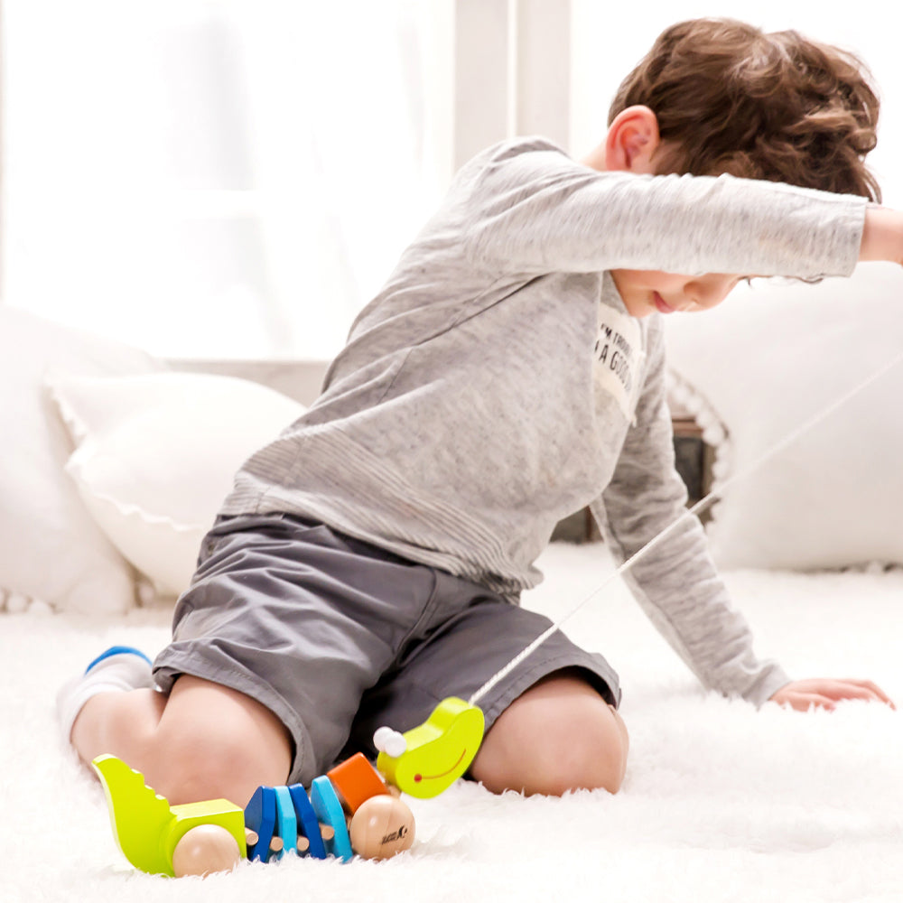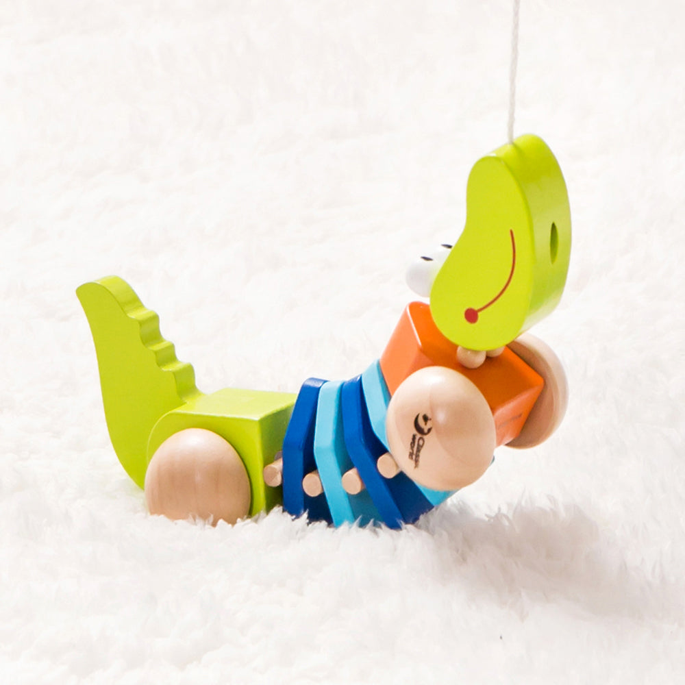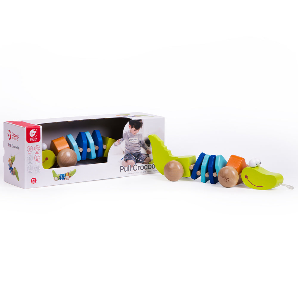 Looking for a new friend for your child? This adorable pull crocodile will be the ideal companion as your toddler takes a long walk around your house! The alligator has a flexible body that will twist or wiggle when pulling it. The body of the crocodile makes “click-clack” sound which will add more fun when your children play with it. This pull crocodile encourages imitative and imaginary play, and stimulates early walking skills.