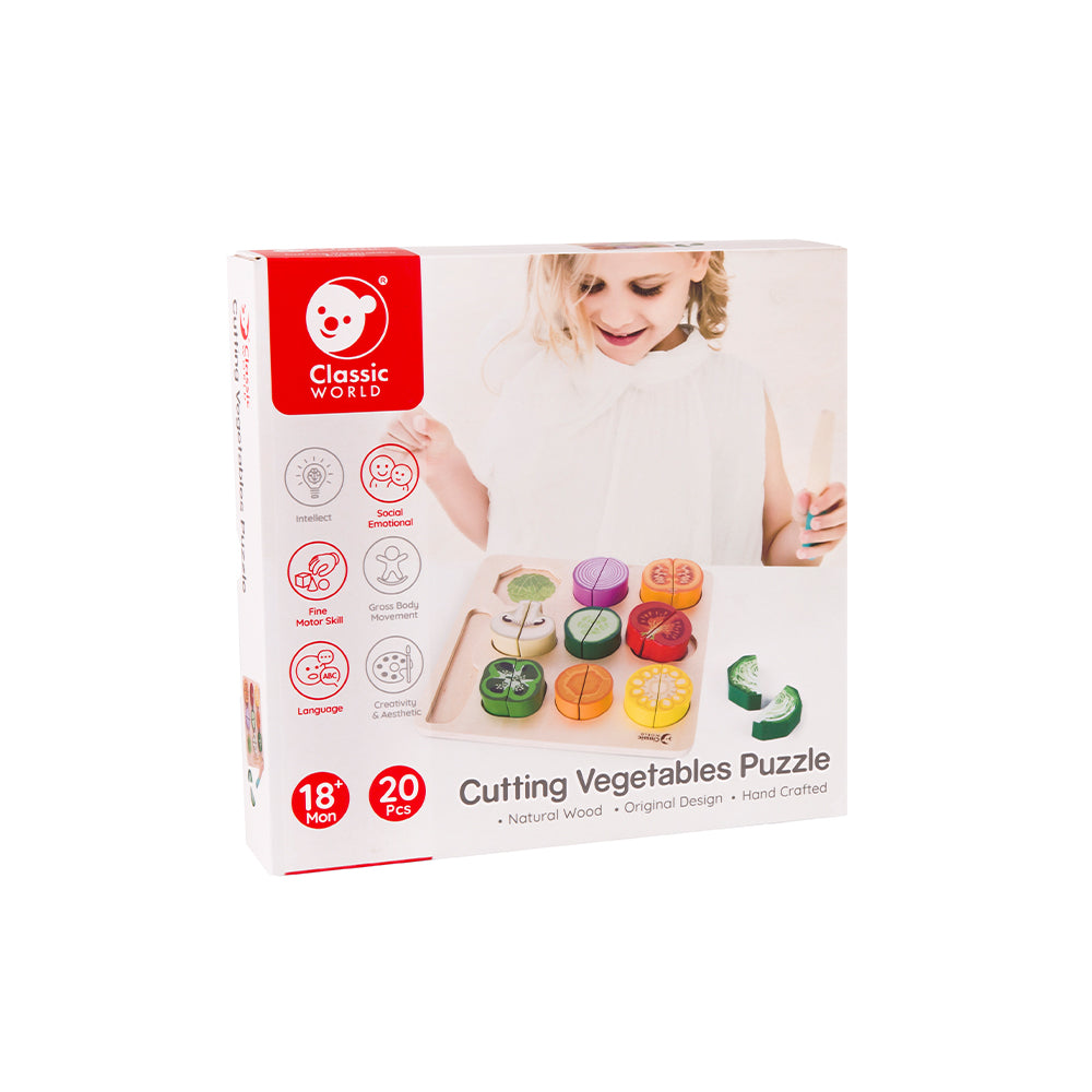 Let's have fun learning about vegetables shapes and color inside and outside with this colorful Cutting vegetables puzzle! The vegetables can be cut on one side of the cutting board and be matched to their complete vegetable image on the opposite side. That is the best healthy choice for training your toddlers hand-eve-coordination and hand flexibility.