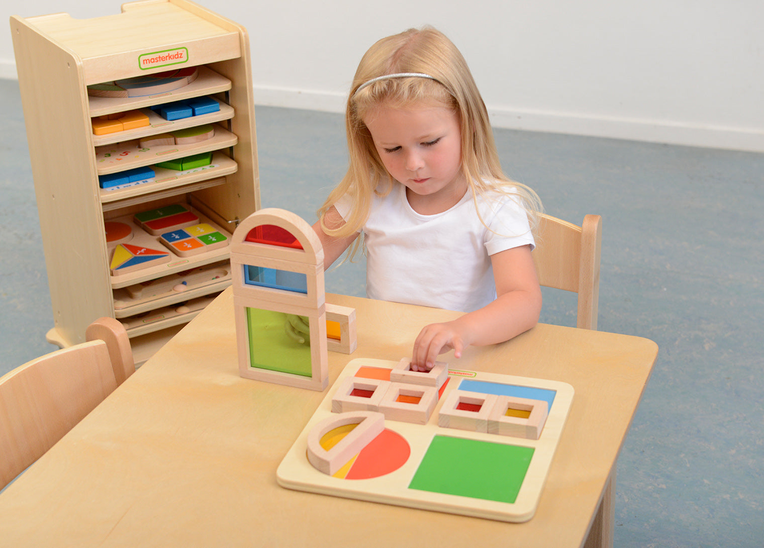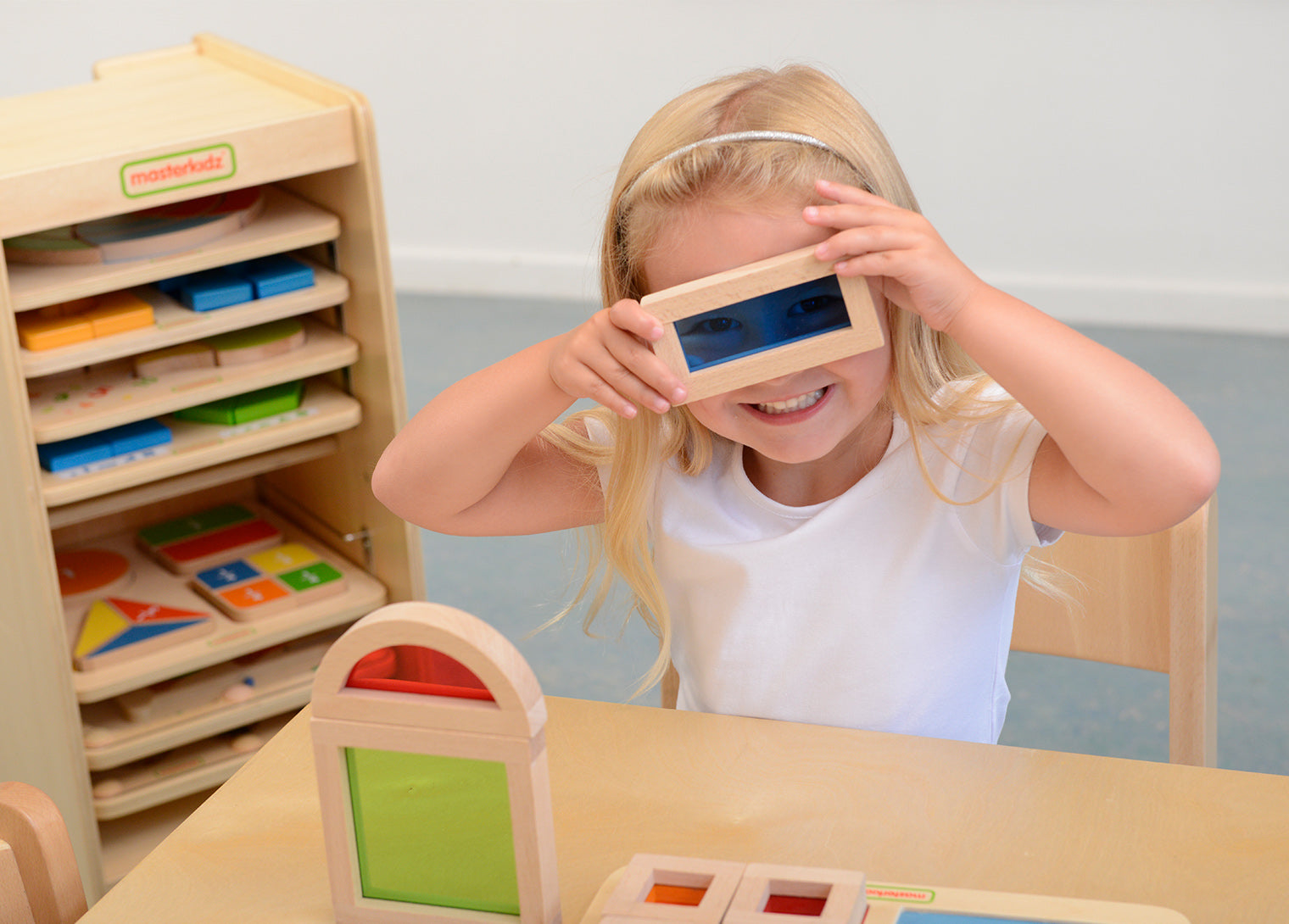 A set of chunky wooden rainbow blocks with different transparent inset colours. Children can use these to hold, build and to stack with, to add interest to small world play environments and to look through to see the world in different colours. Also a useful resource on any light panel.