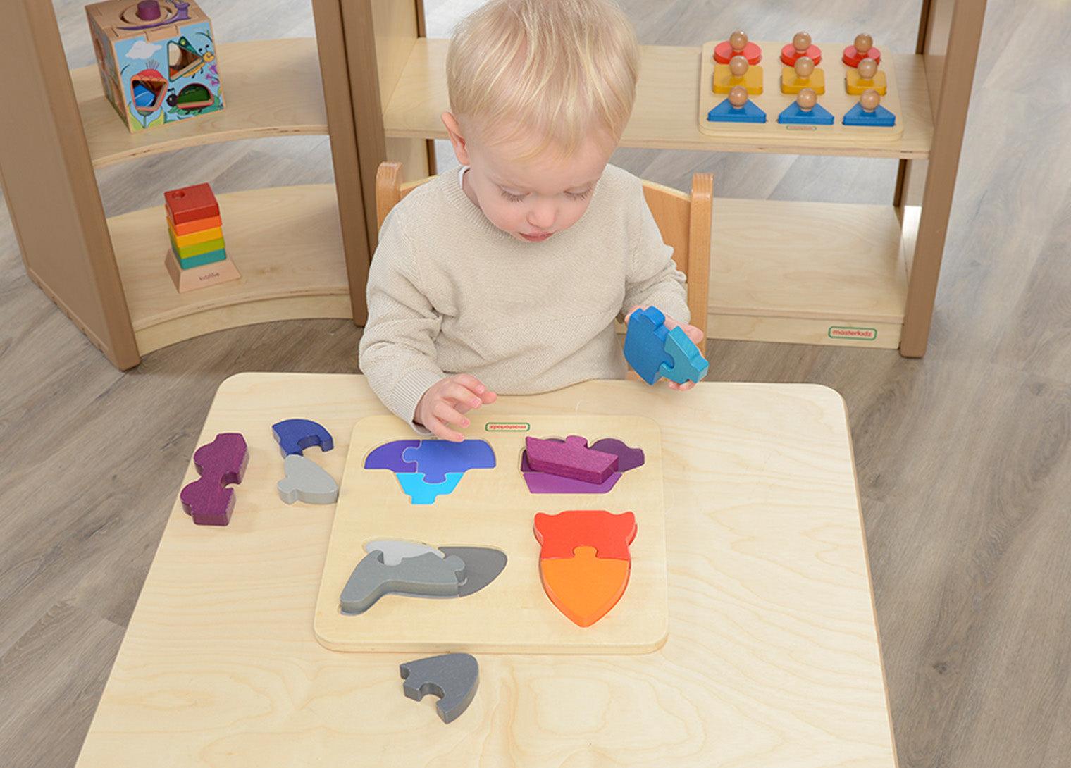 This self-correcting transportation-themed jigsaw puzzle encourages children to pick and place pieces together by trial and error until they create a rocket, an aeroplane, a ship and a car. The success of solving these puzzles will promote a wish to do them again! The set includes 10 chunky beech jigsaw pieces and a wooden tray.