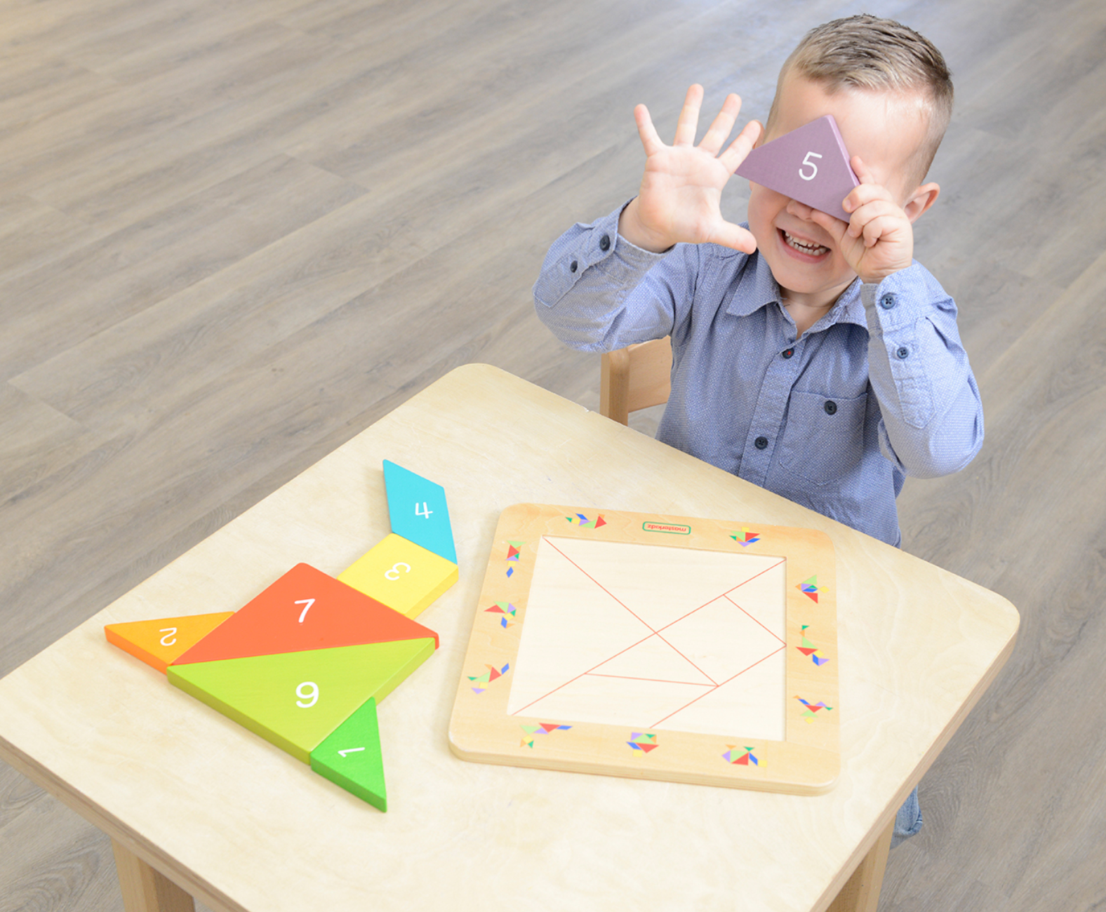 This giant colourful Tangram puzzle provides opportunities for children to use regular shapes to build pictures and designs either in an open-ended way or following a pattern. On the rear of the base are numerous ideas for children to copy strengthening their observation and hand-eye coordination skills. The 7-piece set includes triangles, a square and a parallelogram. Made from hard wearing FSC European beech.